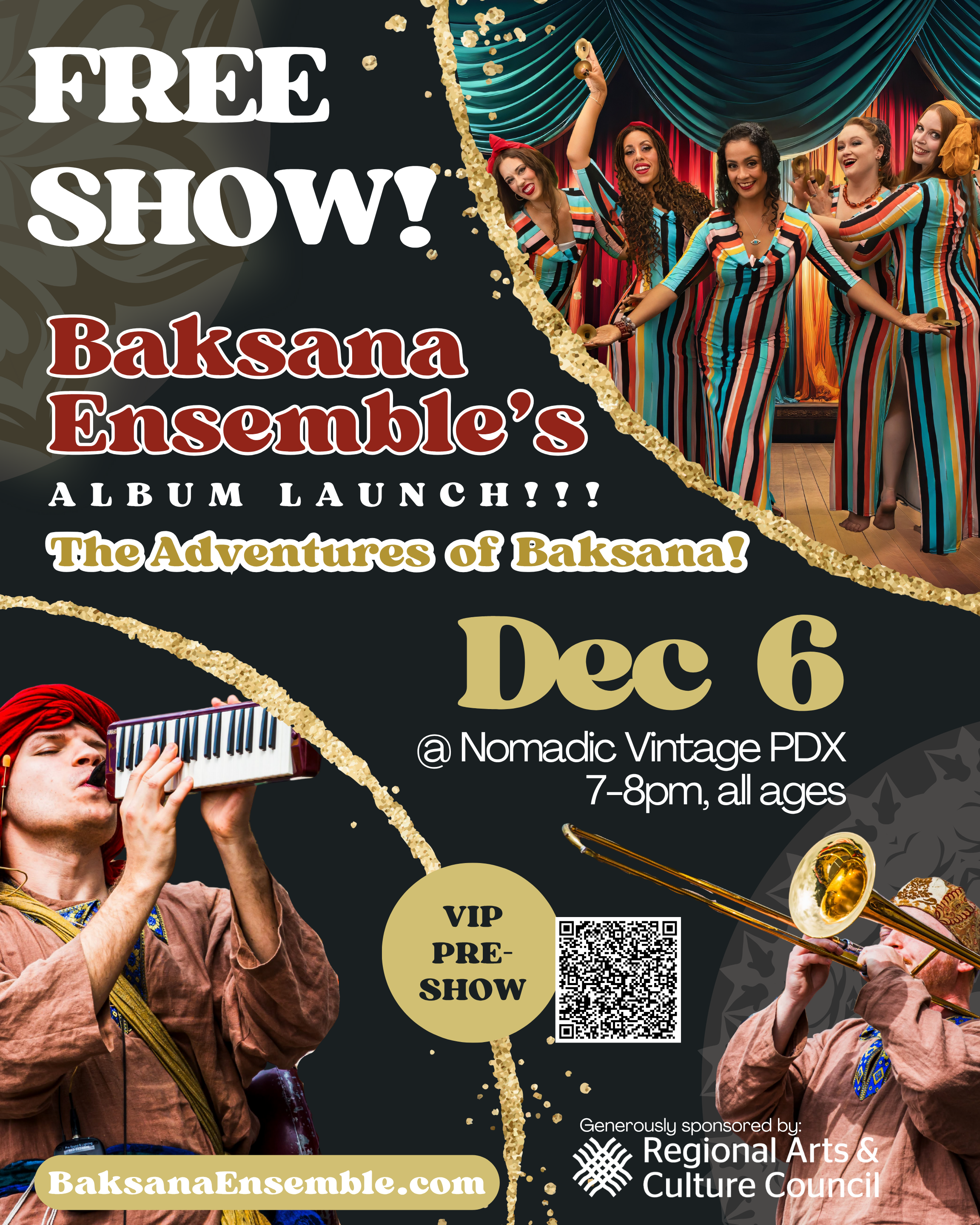 In October 2025, Baksana Ensemble stepped into the studio with Figure 8 Sound in N. Portland, to record a collection of original compositions by Kaya Hellman and Bevin Victoria. The community is invited to join us at Nomadic Vintage PDX (516 SE Morrison St., Portland OR) on December 6th, 2025 at 7pm to hear the songs live and party it up with the band!